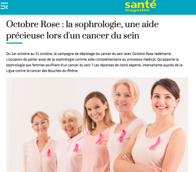 En ma qualité de sophrologue certifiée, j'interviens chaque semaine au sein de la Ligue contre le cancer Cancer Comité des Bouches du Rhône. Dans cet article de Sante Magazine, j'explique en quoi la sophrologie est un outil précieux au service des femmes atteintes du cancer du sein.